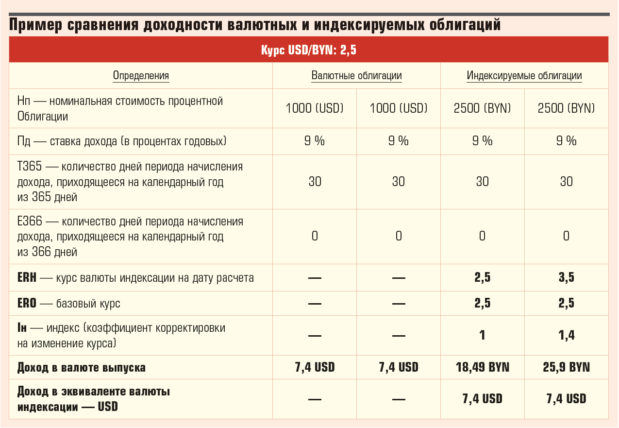 Индексируемые облигации выпускаются в белорусских рублях. Только этим они и отличаются от валютных, где валюта эмиссии иностранная. Однако если влияющий показатель индексируемой облигации – доллар, то в конце обращения инвестор получит такое количество рублей, которое соответствует величине его долларовых вложений в начале обращения облигации. Доходность также считается с коррекцией на изменение курса.