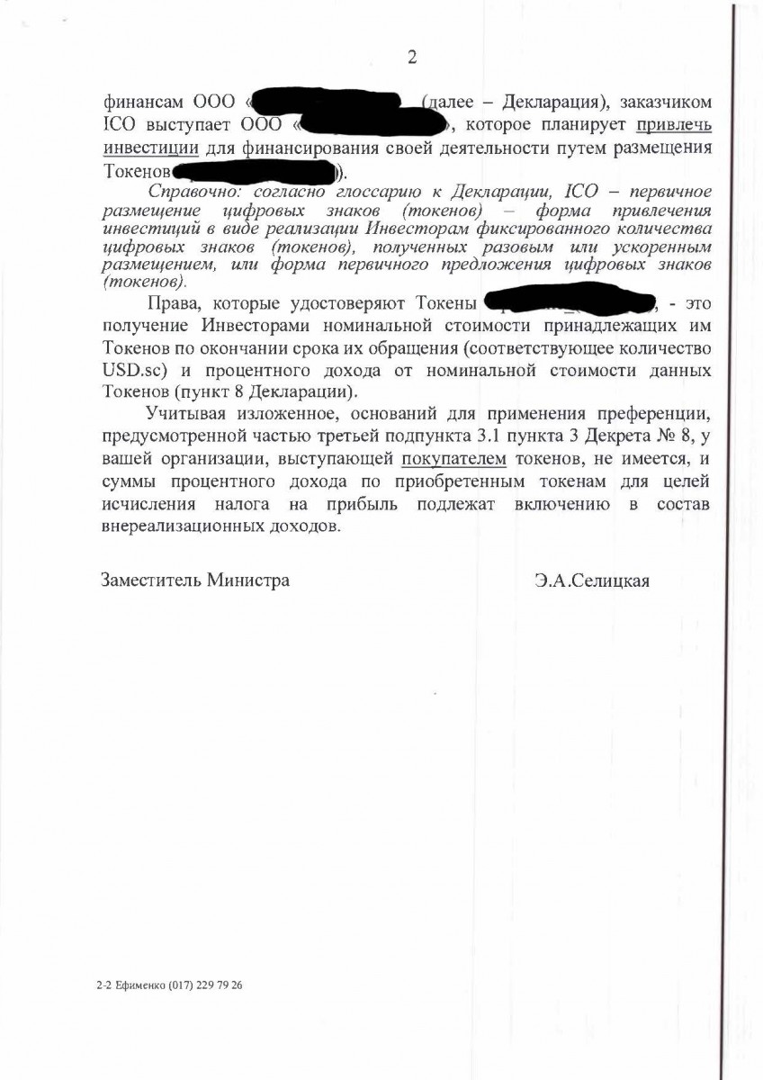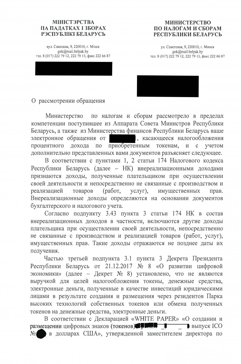 В целях разъяснения вопроса о практическом применения положений вышеуказанного Декрета, Министерством по налогам и сборам подготовлено разъяснение по налогообложению дохода полученных по токенам.