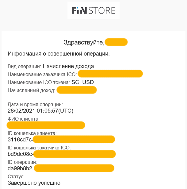 Например, выплаты дохода осуществляется в Stable Coin (USD.sc), например доход по 1 (одному) Токену AVANGARD_(USD_101) за календарный месяц равен 0,16 USD.sc, что эквивалентно 0,16 USD по курсу НБРБ. После зачисления процентного дохода Вам будет отправлено соответствующее уведомление. |