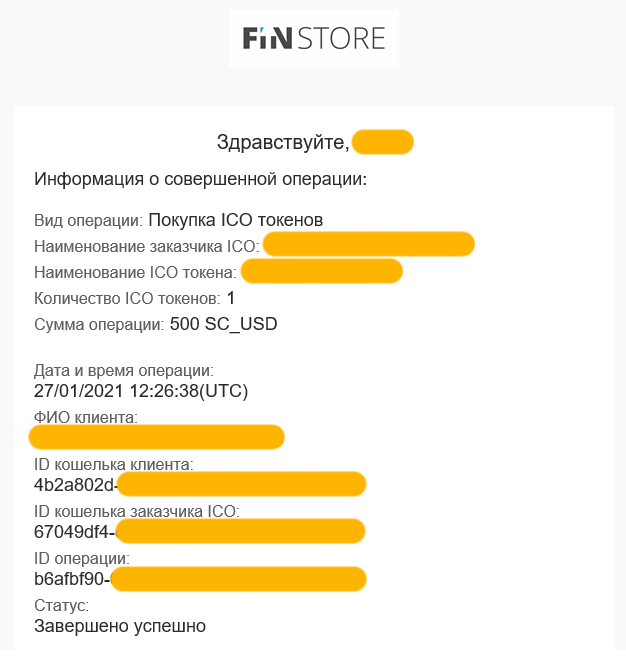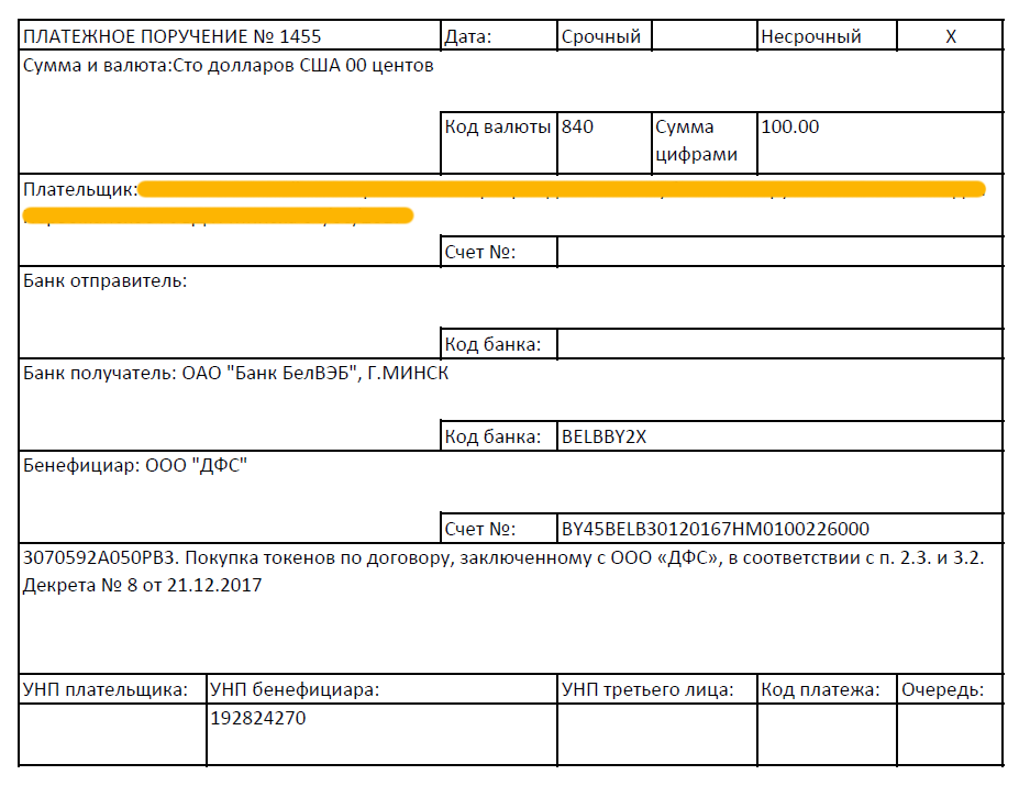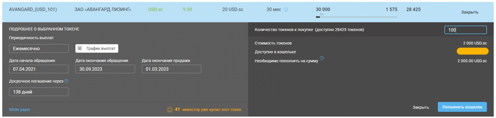Например, стоимость одного Токена AVANGARD_(USD_101) равна 20 USD.sc (Stable Coin), что эквивалентно 20 USD по курсу НБРБ. После совершения покупки Вам будет отправлено соответствующее уведомление. Если сумма инвестиций составит более 10 000 USD, у вас могут запросить перечень документов подтверждающих источники дохода. |
